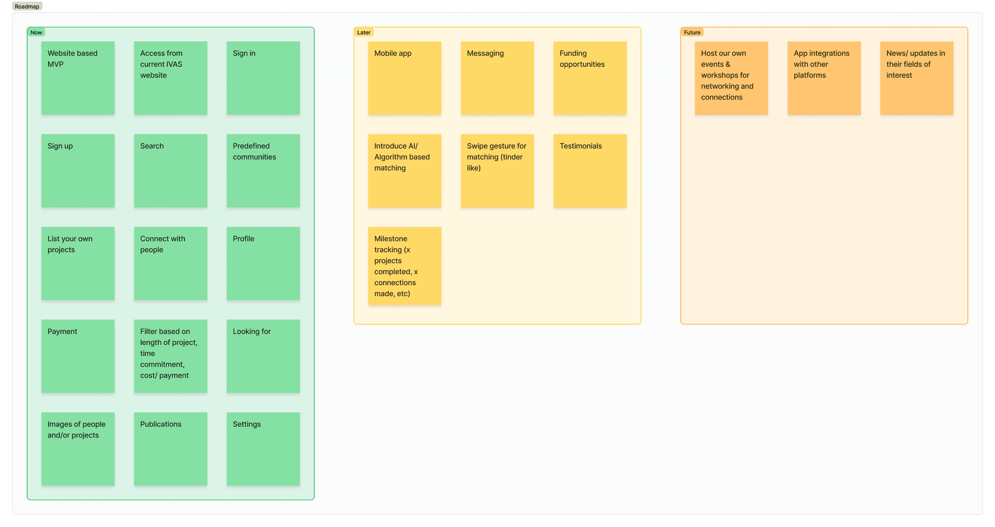 On the design side, I mapped user journeys for both academics and institutions, knowing that each had very different needs. I structured the platform into groups, projects, interests and skills, and built the roadmap that split work into what we could prove in an MVP, what could come later, and what was part of the long-term vision.