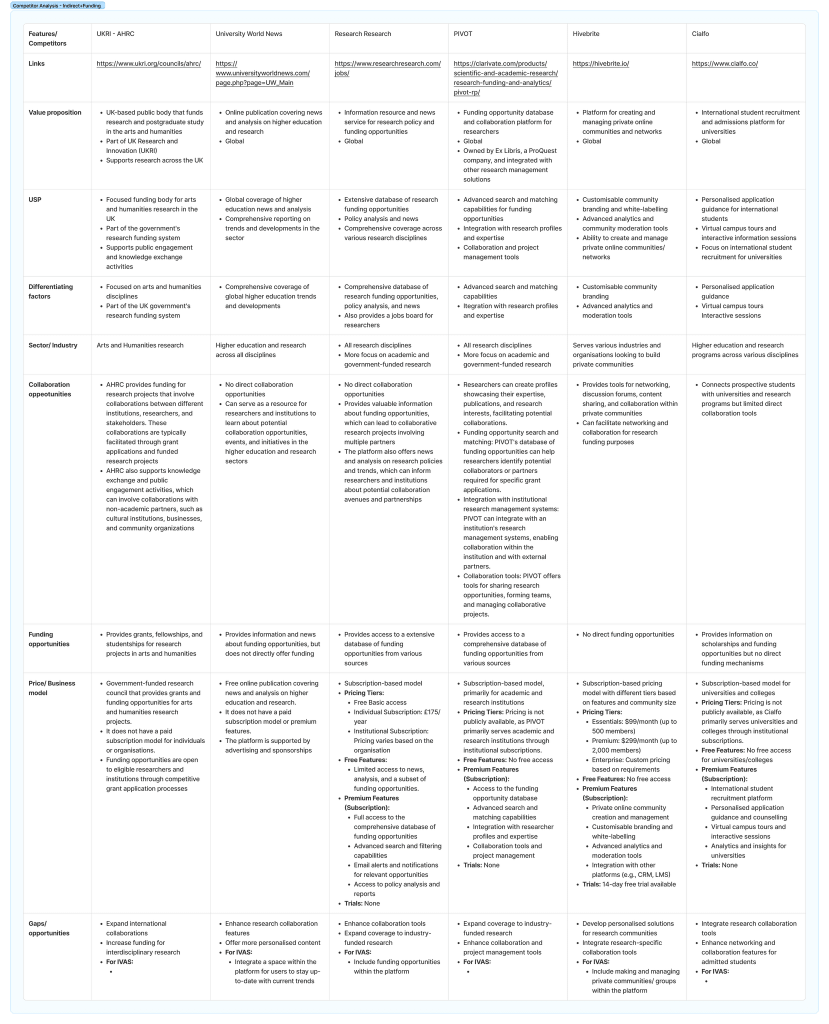 Beyond speaking to people, I mapped the existing landscape. I reviewed university repositories, funding portals, and academic networking tools. Each had some value, but none were built for cross-institution visibility in the humanities and social sciences. Most tools were either too generic, designed for any kind of networking, or too narrow, locked within one institution or funding stream.